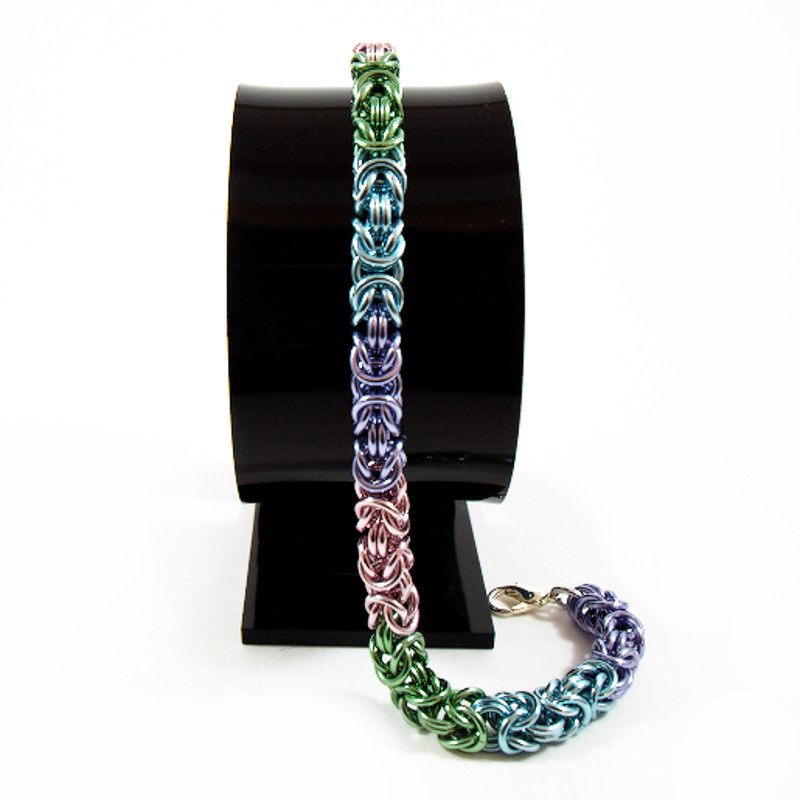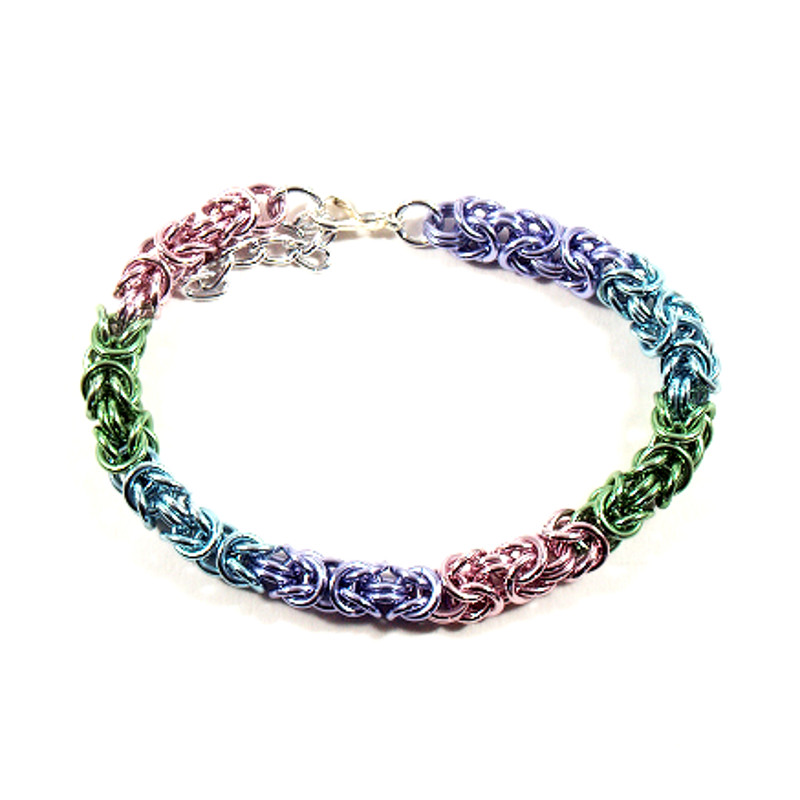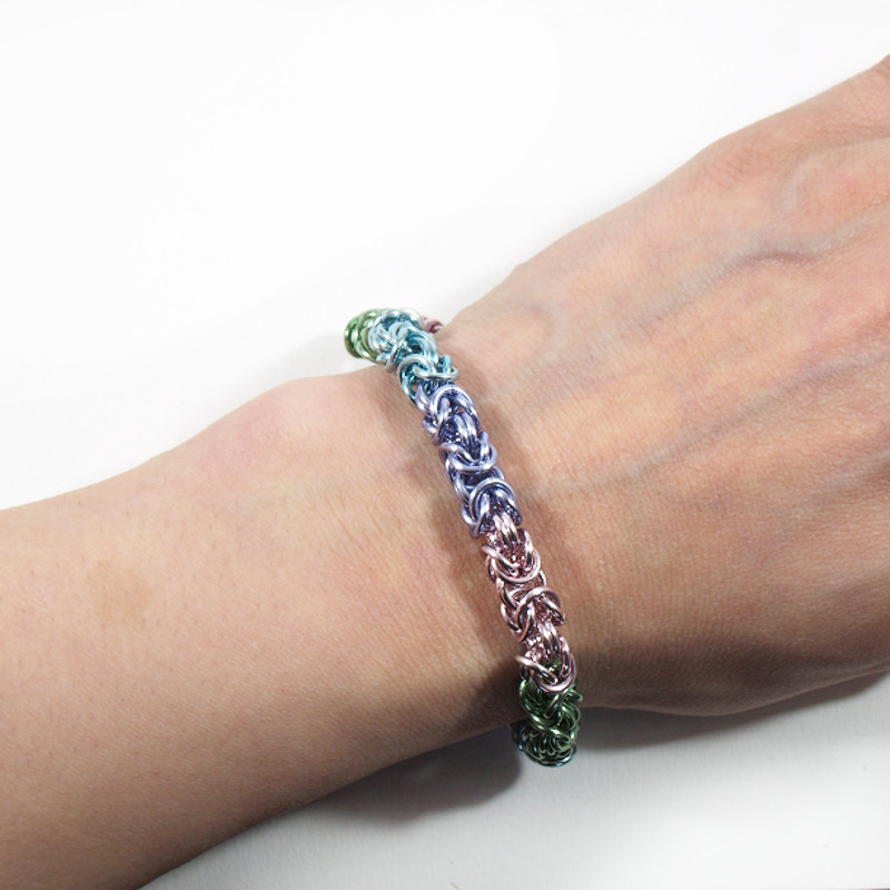 This beautiful bracelet has a wonderfully distinctive appearance in both colour and style. It is made using a byzantine weave which has an intricate interlocking design.
