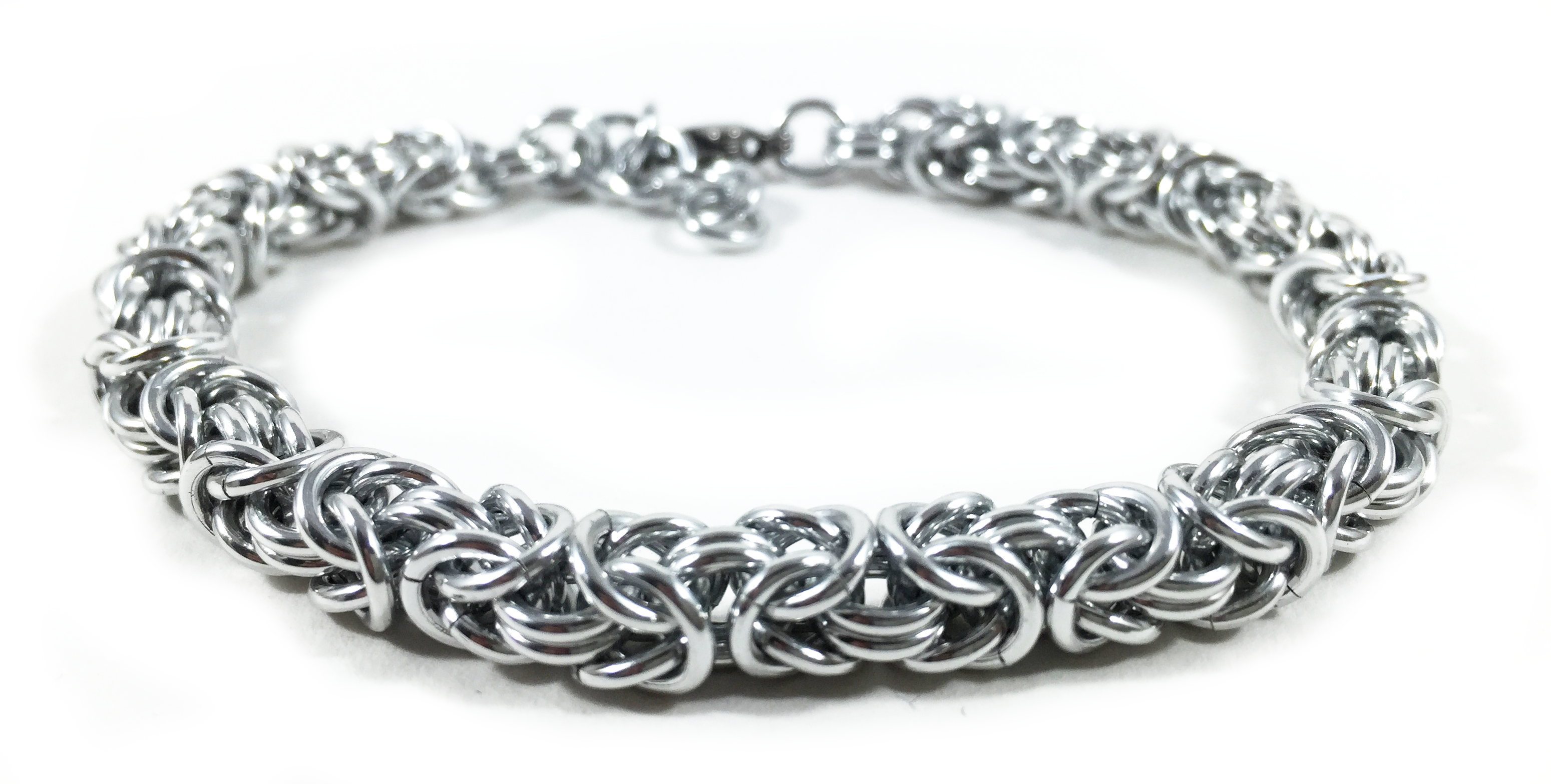 This bracelet is 7 1/2" long with a 1" extender chain and is fitted with a stainless steel lobster clasp. Made using high quality anodised aluminium jump rings. Aluminium is a safe metal which is non-allergenic and is lighter and cheaper than silver. Unlike silver it will not tarnish and it is completely waterproof.