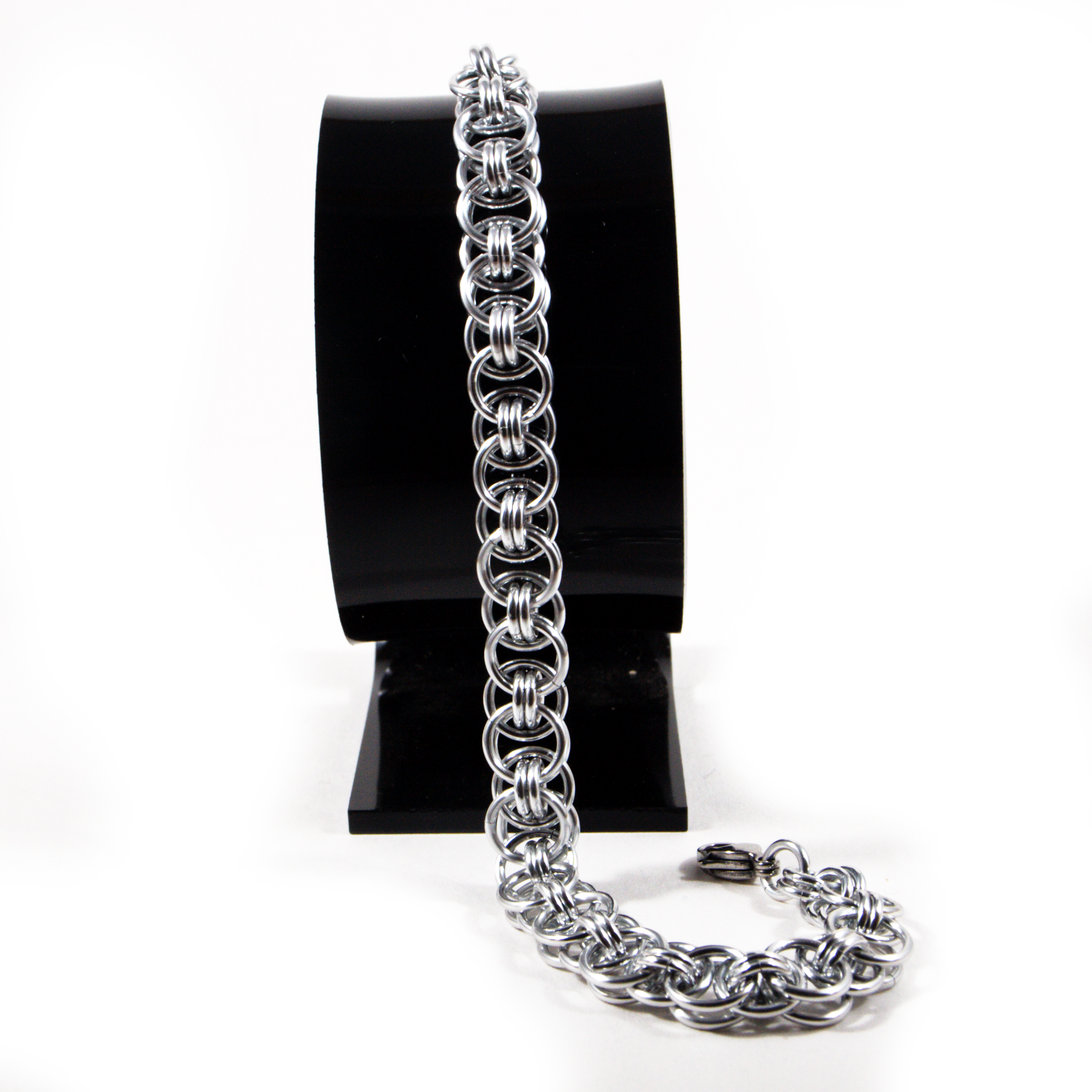 This bracelet is 7 1/2" long with a 1" extender chain and is fitted with a stainless steel lobster clasp. Made using high quality anodised aluminium jump rings. Aluminium is a safe metal which is non-allergenic and is lighter and cheaper than silver. Unlike silver it will not tarnish and it is completely waterproof.